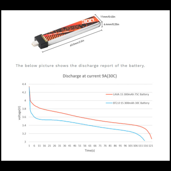 With an impressive discharge rate of 75C, the 1S 300mAh battery has a BT2.0 connector and operates at a voltage of 3.8V.