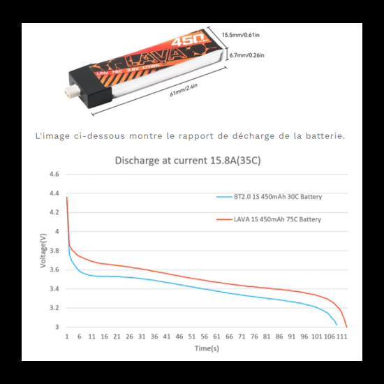 With an impressive discharge rate of 75C, the 1S 450mAh battery has a BT2.0 connector and operates at a voltage of 3.8V.