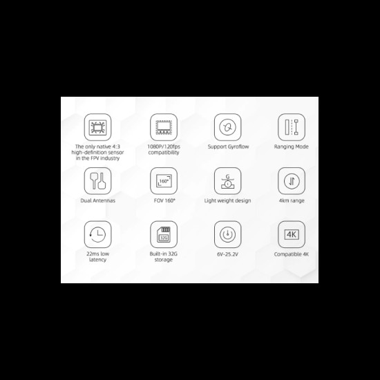Get video feedback up to 1080p at 60 fps with a low latency of 22ms and record your flights in 1080p at 120 fps thanks to the 32GB internal storage.